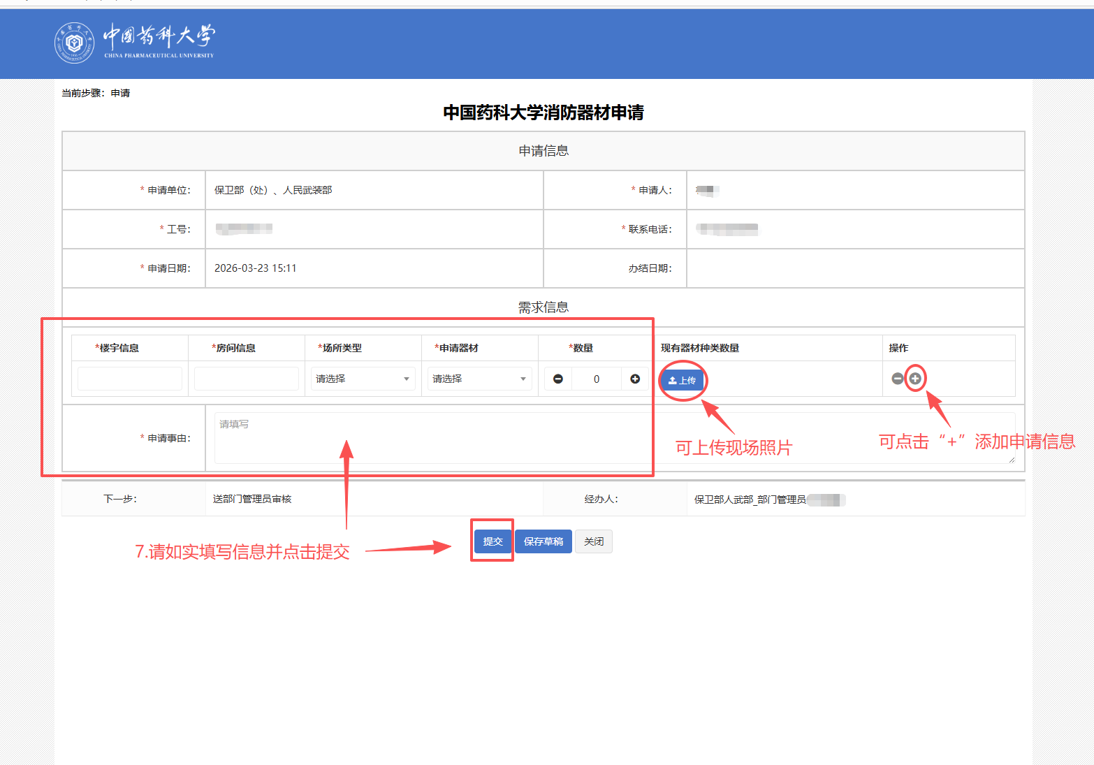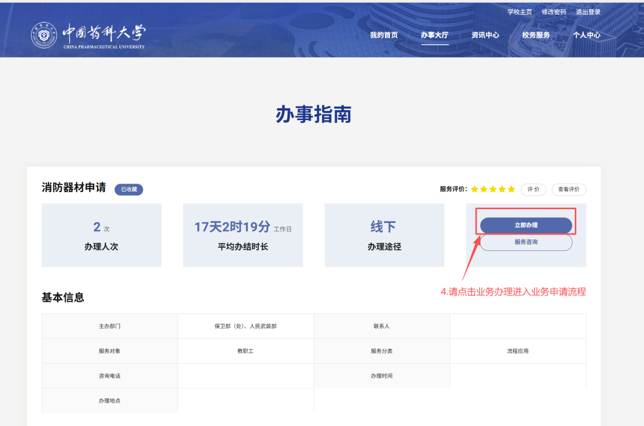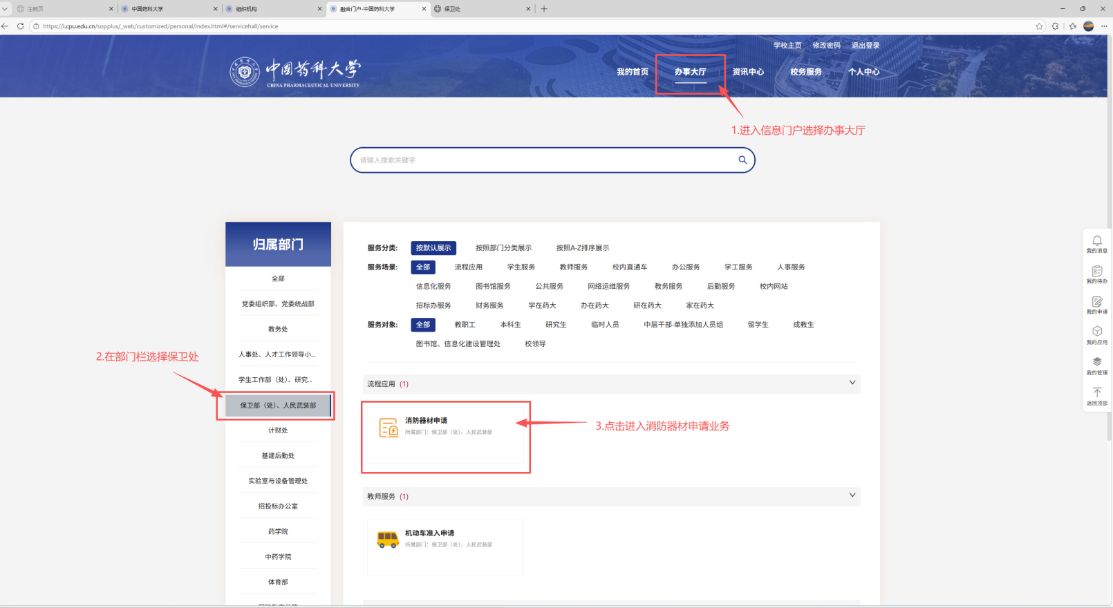为方便全校师生,落实“信息多跑路、人员少跑路”工作要求,切实服务全校师生。保卫处即日起开通线上办理消防器材申请业务,不再受理纸质申请。具体流程如下: