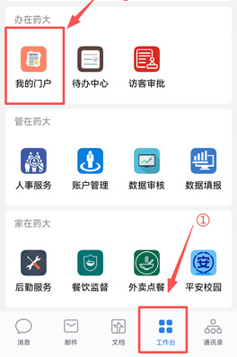 (1)打开企业微信,选择“工作台”的“我的门户”