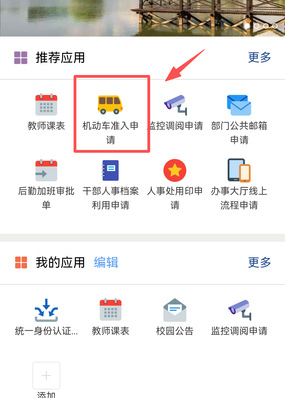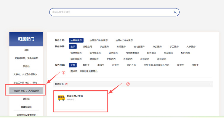 (2)在所属部门一栏选择保卫处(部)、人民武装部,随后选择机动车准入申请。